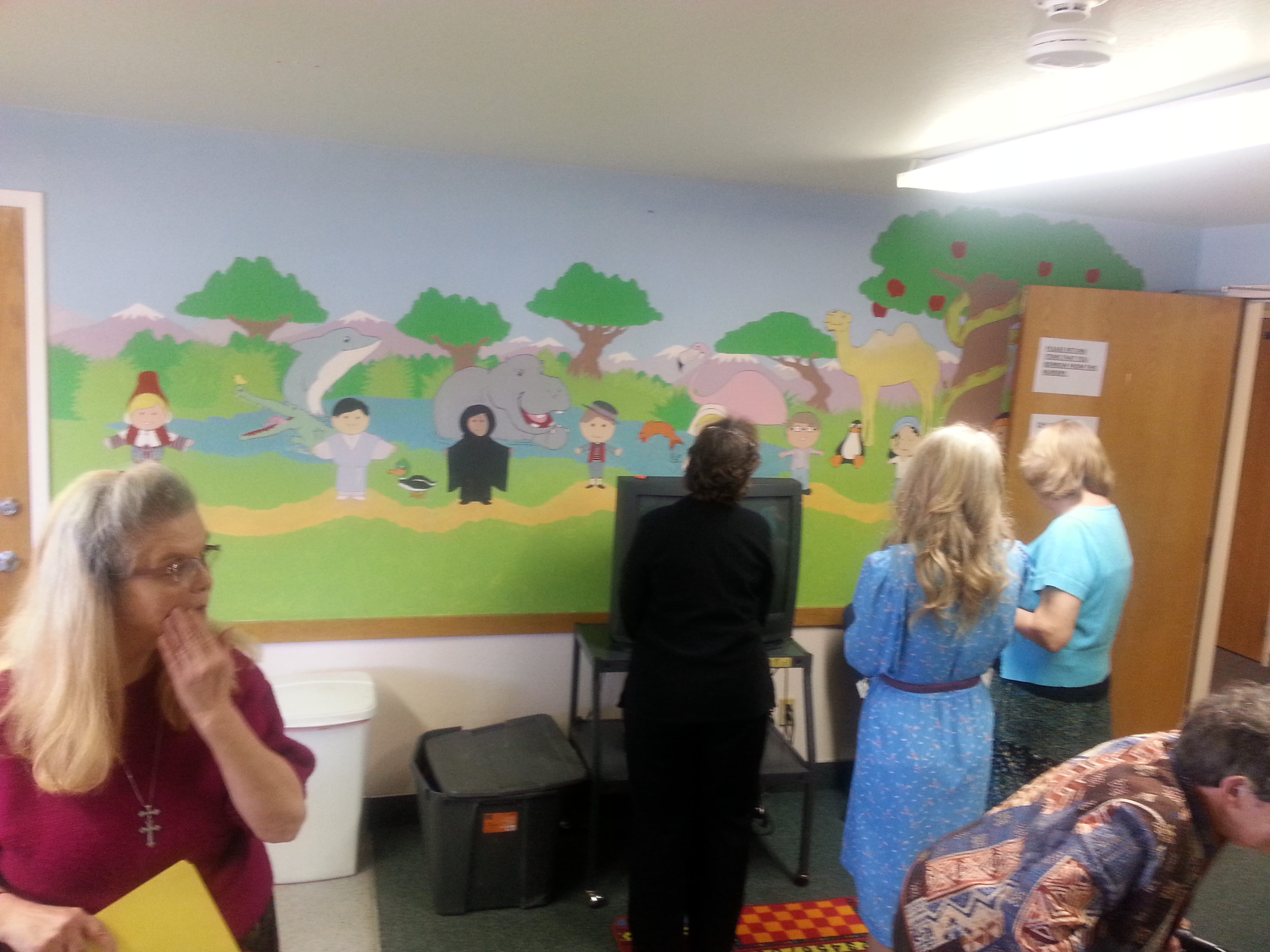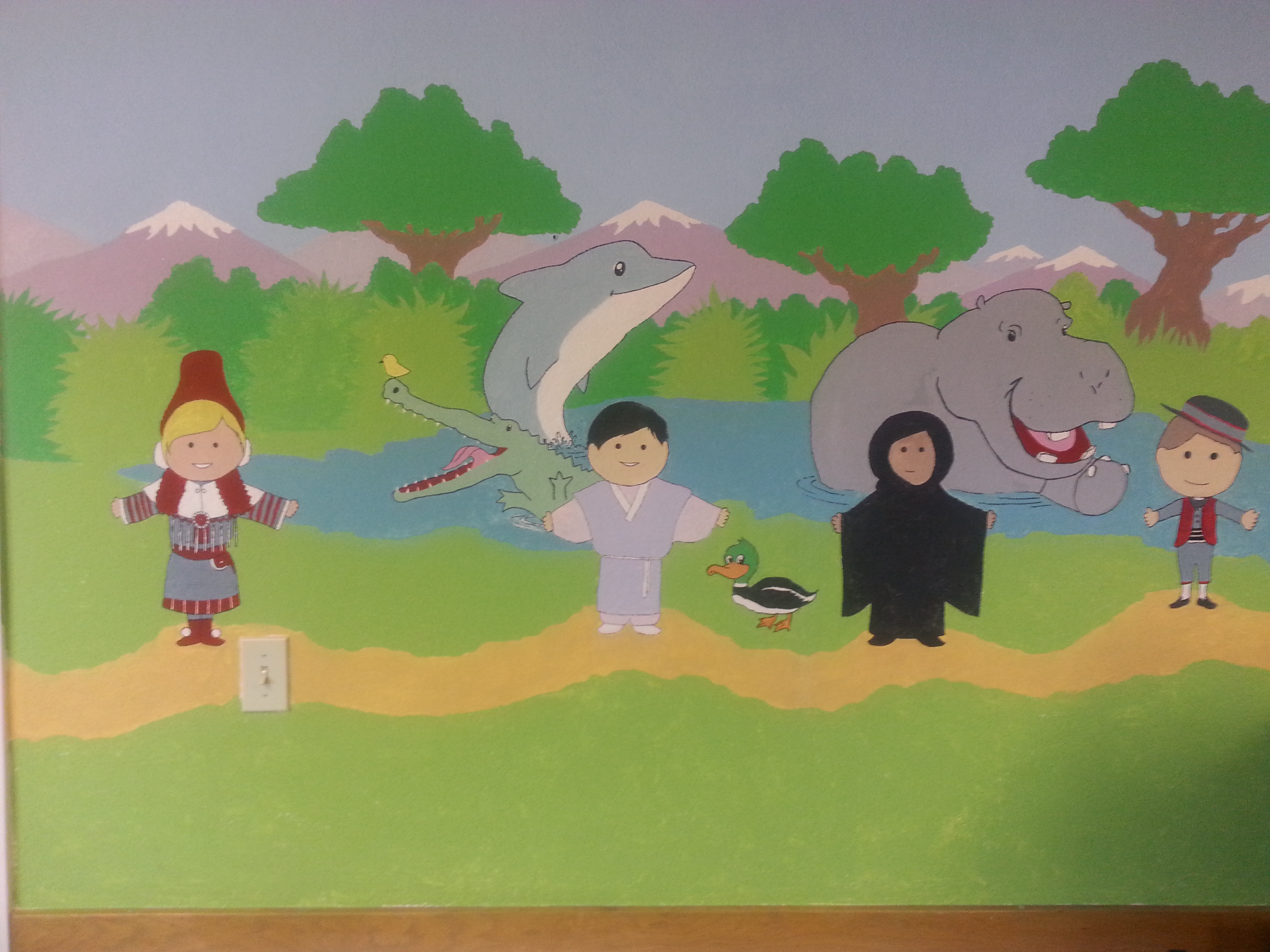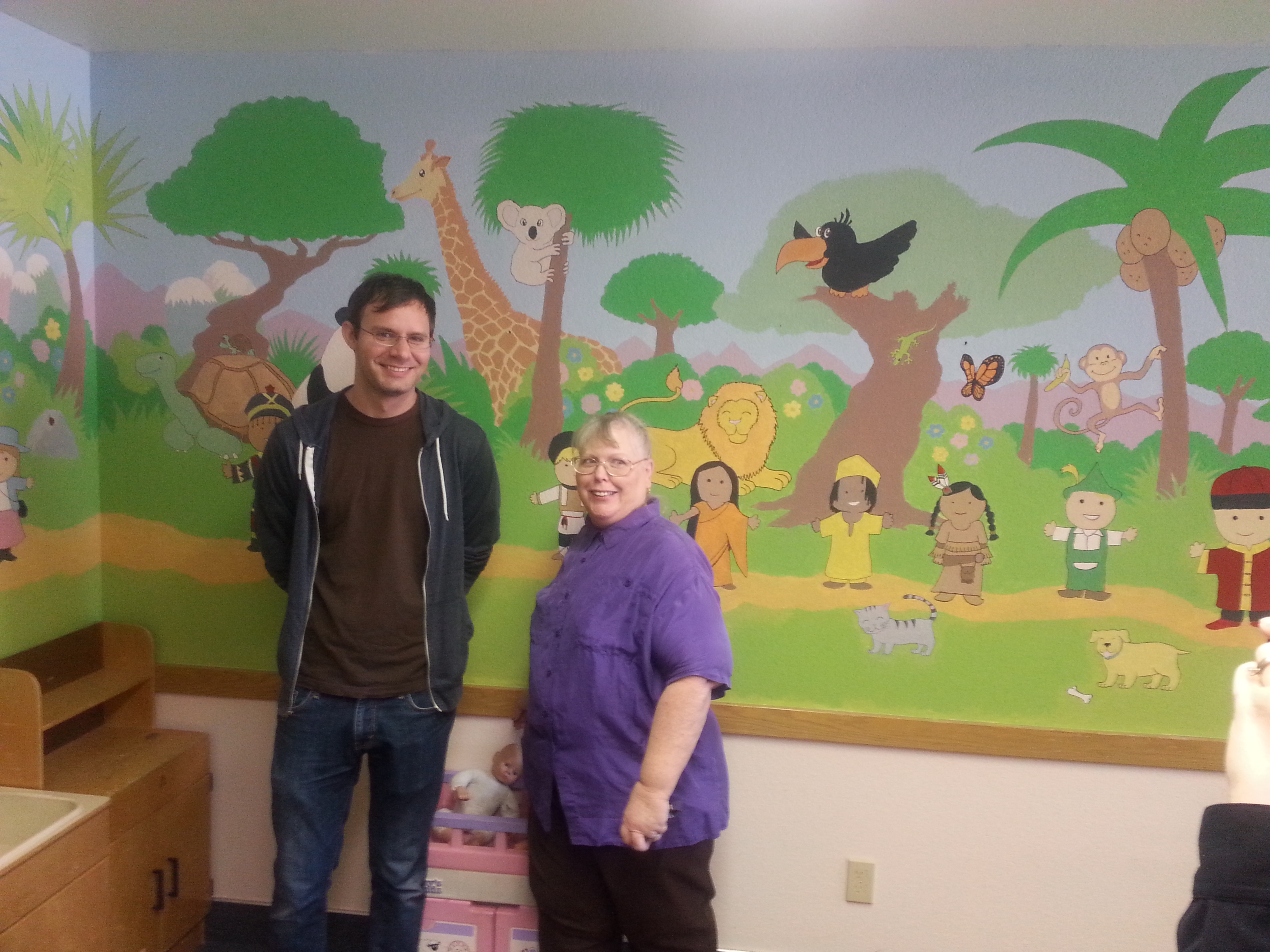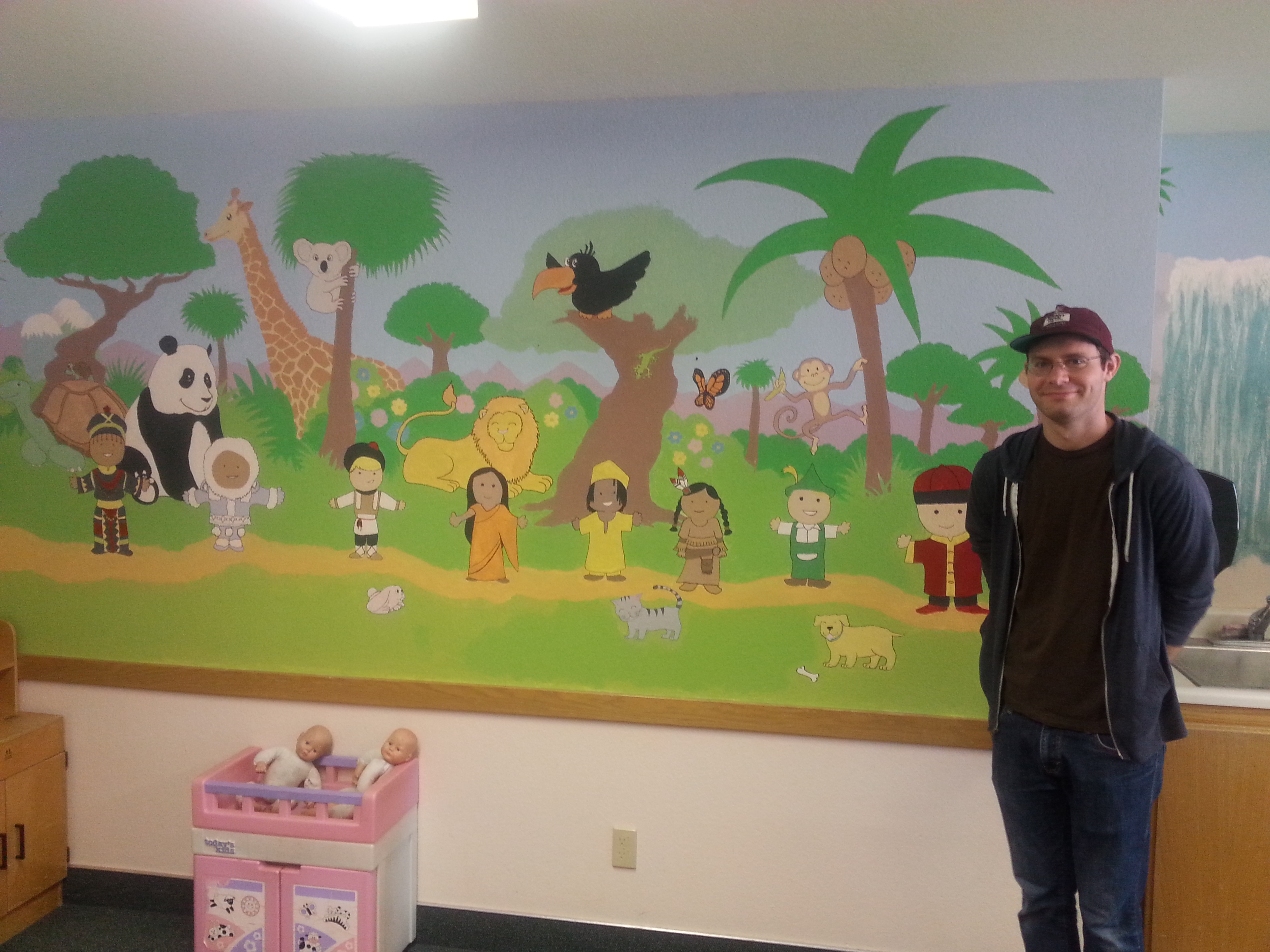 April 12, 2015 by ronz Artist Ian Goudelock’s gift to Memorial’s toddler Sunday school room dedicated today. (open this post for photo gallery) Artist Ian Goudelock with Mural Ian and Dorrie, Childcare Coordinator Viewing Ian’s Mural Viewing Ian’s Mural Viewing Ian’s Mural Ian’s Mural Ian’s Mural Ian’s Mural